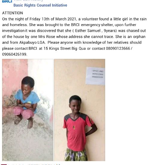 “On the night of Friday of March 2021, a volunteer found a little girl in the rain and homeless. She was brought to the BRCI emergency shelter, upon further investigation it was discovered that she ( Esther Samuel , 9years) was chased out of the house by one Mrs Rose whose address she cannot trace. She is an orphan and from Akpabuyo LGA. Please anyone with knowledge of her relatives should please contact BRCI at 15 Kings Street Big Qua or contact 08090123666 / 09060426199”