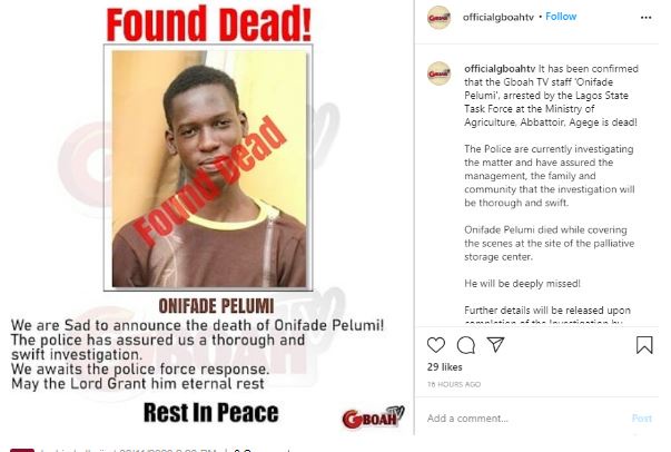 It has been confirmed that the Gboah TV staff ‘Onifade Pelumi’, arrested by the Lagos State Task Force at the Ministry of Agriculture, Abbattoir, Agege is dead!