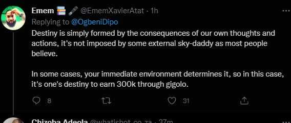According to him, any sugar mummy who pays a guy N300k per night to sleep with him is using his destiny. He further urged men not to fall for quick money and in the course end up useless in life.