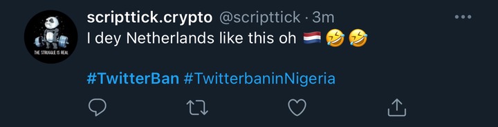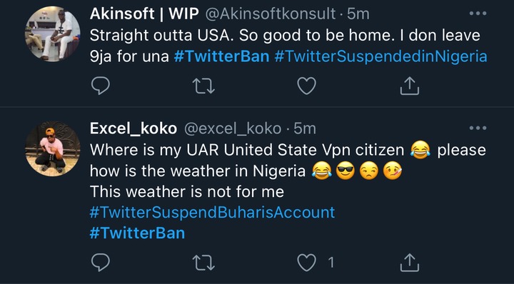 @Akinsoftkonsult wrote: “Straight outta USA. So good to be home. I don leave 9ja for una #TwitterBan #TwitterSuspendedinNigeria.”