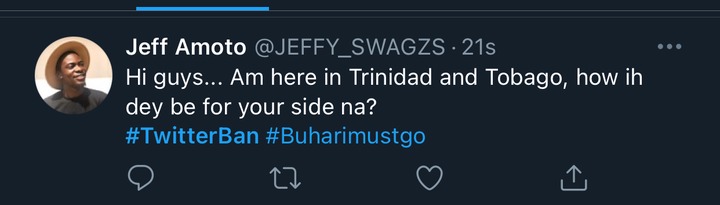 @JEFFY_SWAGZS wrote: “Hi guys… Am here in Trinidad and Tobago, how ih dey be for your side na? #TwitterBan”