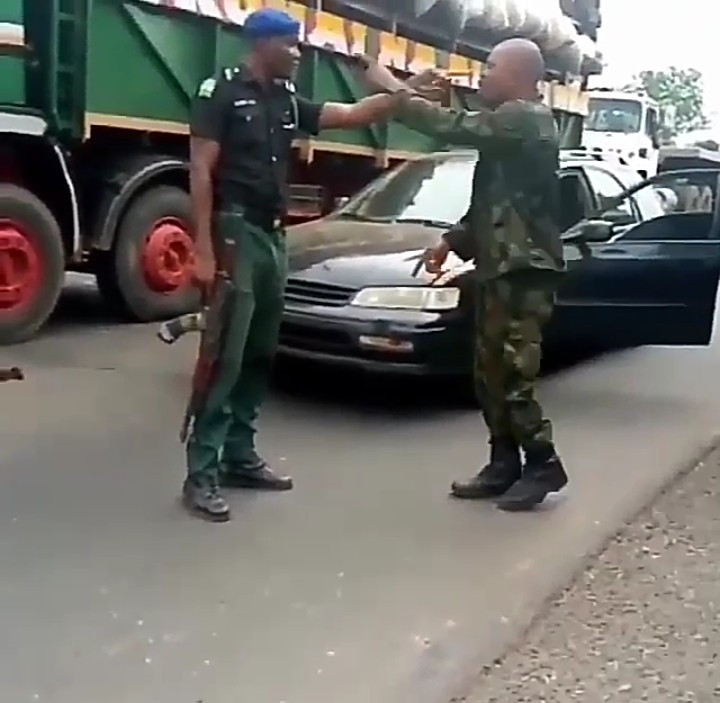 “You don’t know your senior, abi? Am I your mate?” The police officer said, pointing his finger in the soldier’s face.