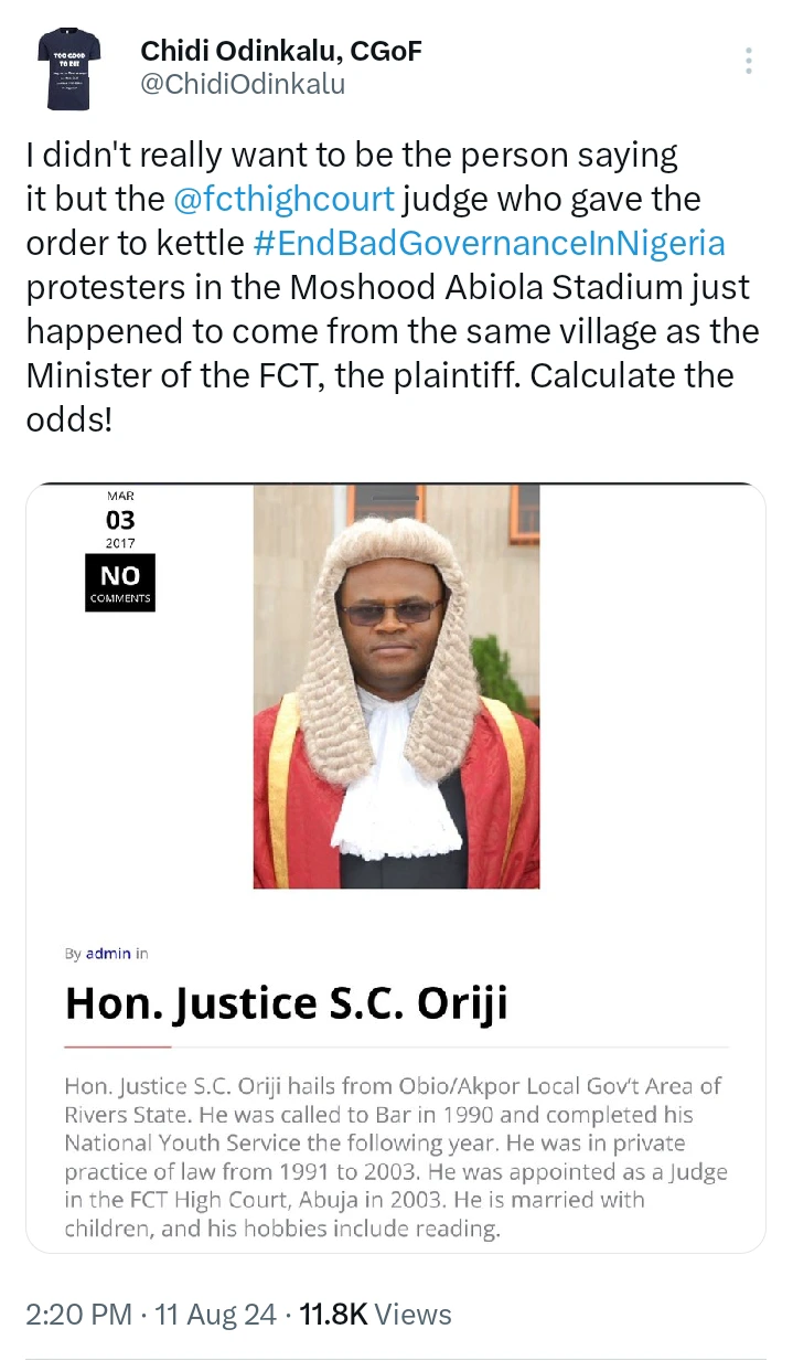 In a statement posted on his official X account, Odinkalu stated that the FCT High Court Judge, who issued the order to relocate the protesters to Moshood Abiola Stadium, hails from the same village as Nyesom Wike, the Minister of the Federal Capital Territory (FCT).