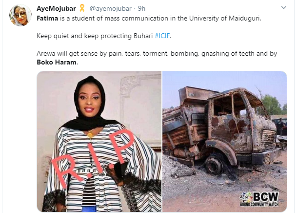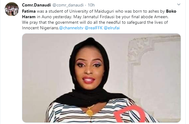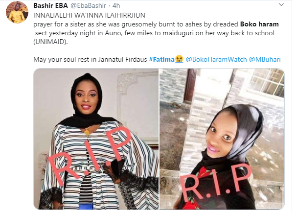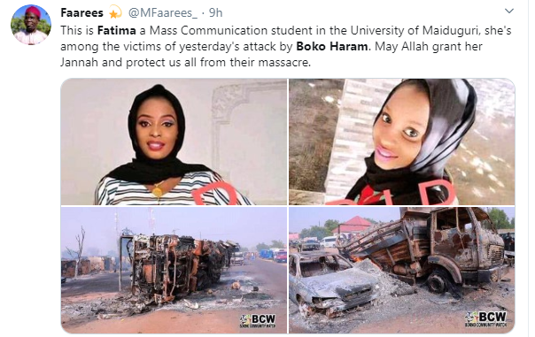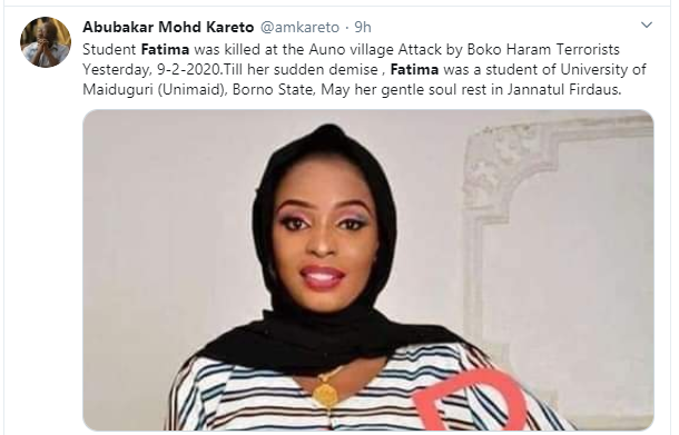 Following the attack which took place at about 9:50pm on Sunday, February 9, at Auno village, Borno by the dreaded terror group, Boko Haram, that left no fewer than 30 dead and a yet to be disclosed number of people, particularly women and children missing, a University of Maiduguri Mass Communication student, Fatima has been identified as one of the 30 people killed by Boko Haram terrorists during the Sunday’s attack.