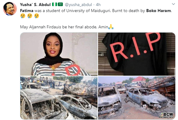 According to reports, Fatima was burnt to death by the insurgents who also abducted many women and children in the attack which occurred while she was on her way back to school.